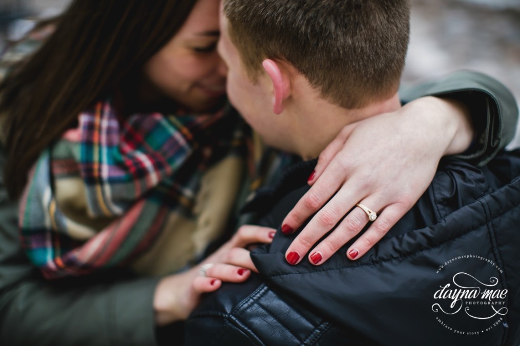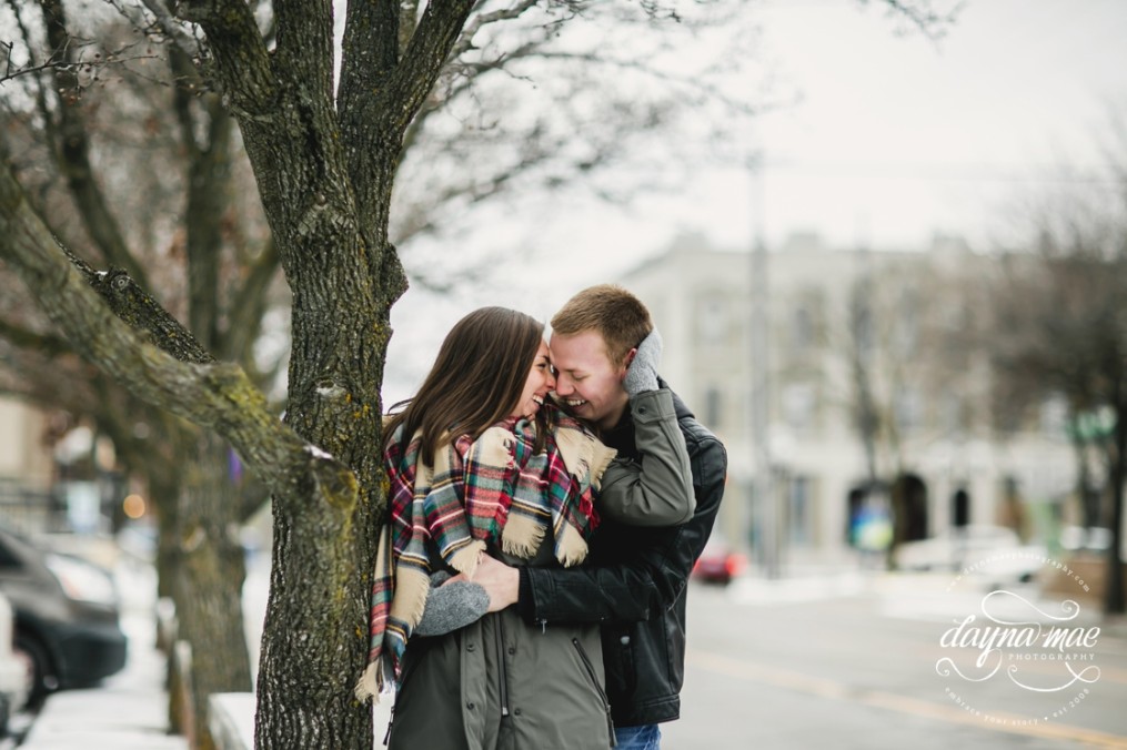 Can I just say, that couples like them – give a certain fresh beat to my heart.  It was a balmy 12 degrees out during their engagement session Downtown Ann Arbor – and though we felt as though our fingers may actually fall off, the warmth between the two of them never left. I may add,  Ryan was desperate to wear my fuzzy ear muffs – and a champ for putting on my hot pink gloves to keep his fingers from turing blue.